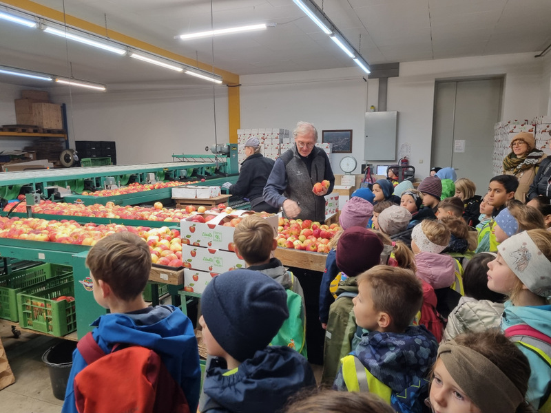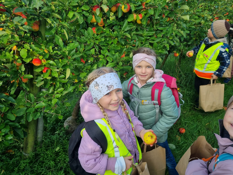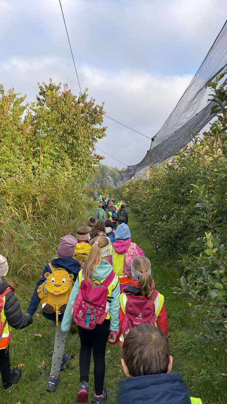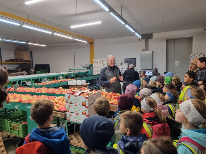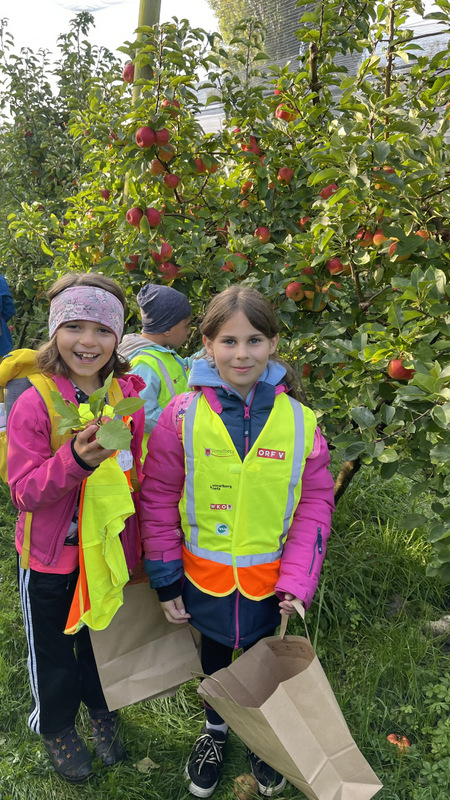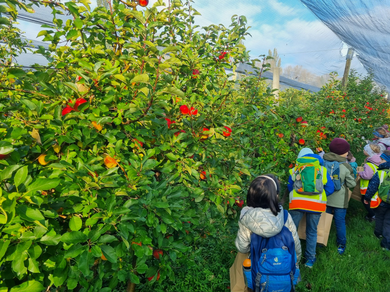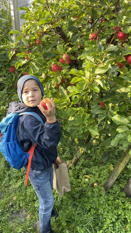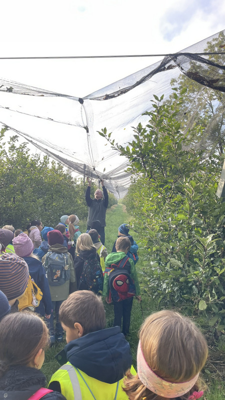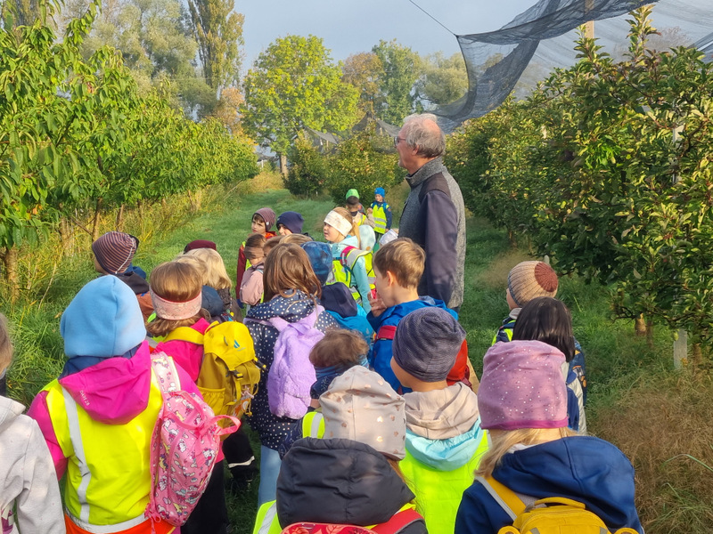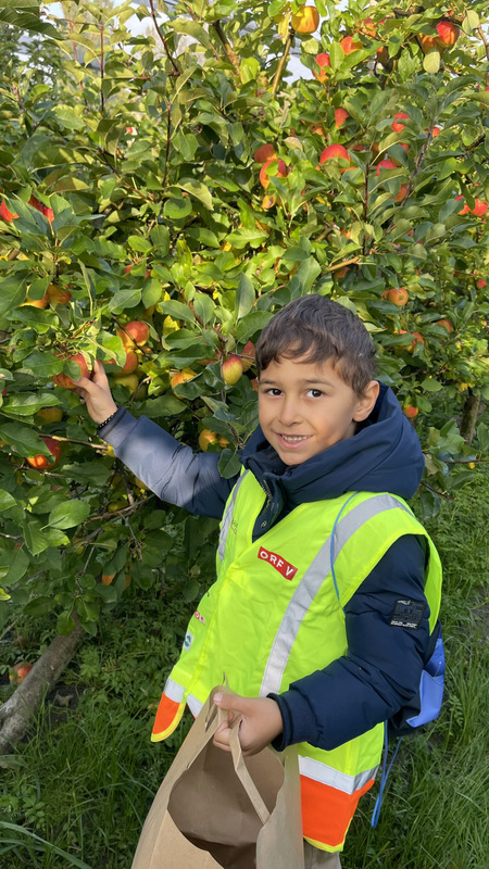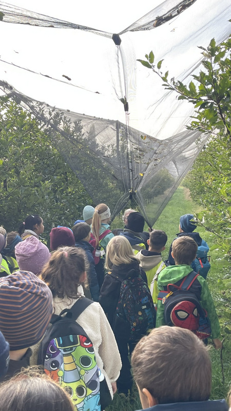 Am 15. Oktober 2025 machten sich die Klassen 1a und 1b auf den Weg zum Wiesenhof. Dort erwartete uns Herr Jens Blum. Er begrüßte uns herzlich und führte uns über seinen Apfelhof. Wie durften sogar selbst Äpfel pflücken – das war ein tolles Erlebnis! Ein großes Dankeschön an Herrn Blum für die interessante Führung, die Zeit und die leckeren Äpfel, die wir mitnehmen durften. Wir hatten einen schönen, lehrreichen Vormittag auf dem Wiesenhof.