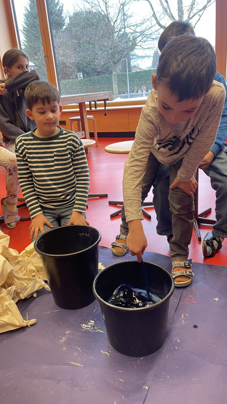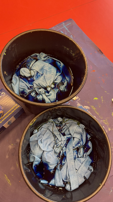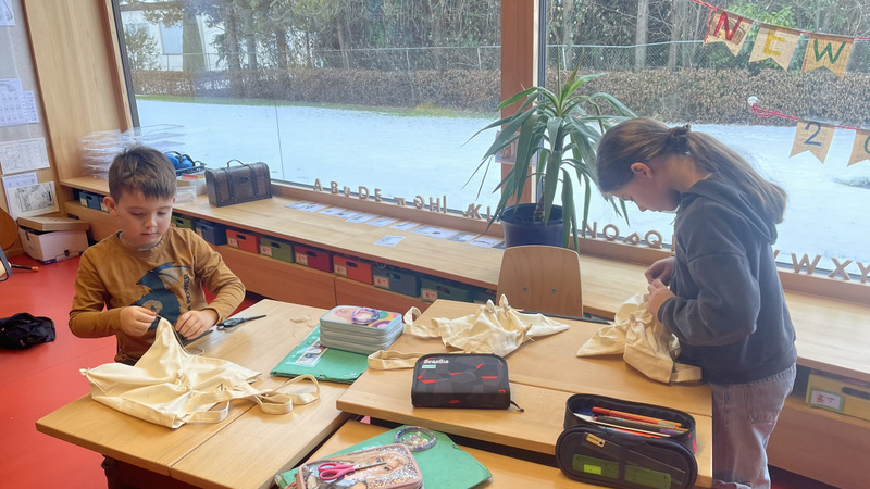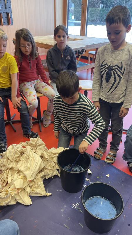 Die Kinder haben ihre Büchereitaschen gestaltet und dabei die Technik Batik kennen gelernt – es sind richtig schöne Unikate entstanden!